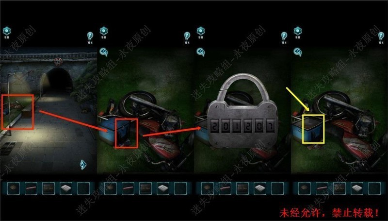 返回隧道入口,检查摩托车,于外卖箱锁输入201207,取得。