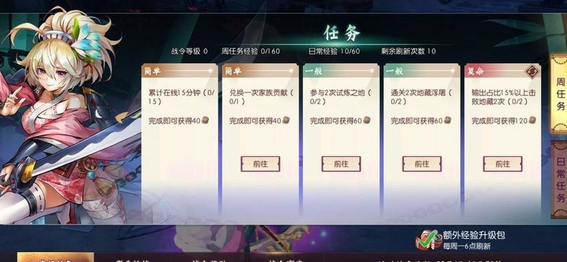 每周任务类型多样,复杂任务可重置。对大号来说,建议地藏或凶国输出达到15%,相对轻松完成。