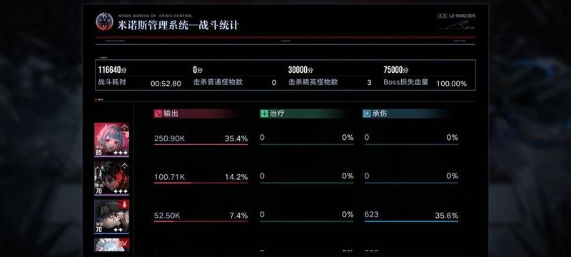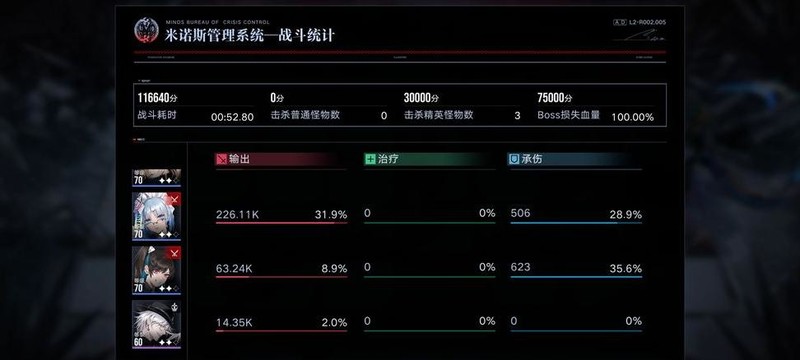 本周增益效果为破核承伤50%,BOSS血量减少30%。此地图27万战力通关难度极高,BOSS仅存活6秒,卓雅、兰利大招释放过慢,科西二次大招需蓄力。当前阵容能量供给效率最高,最适合白老板快速输出。