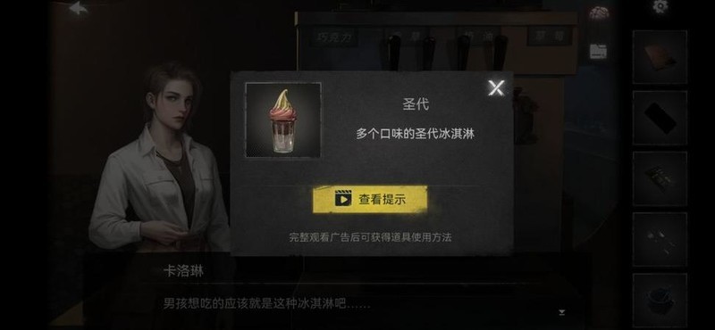 前往山姆的桌子,依据线索1拼合木桶取得木杯,将圣代交给他后获得一本二手书和线索4。