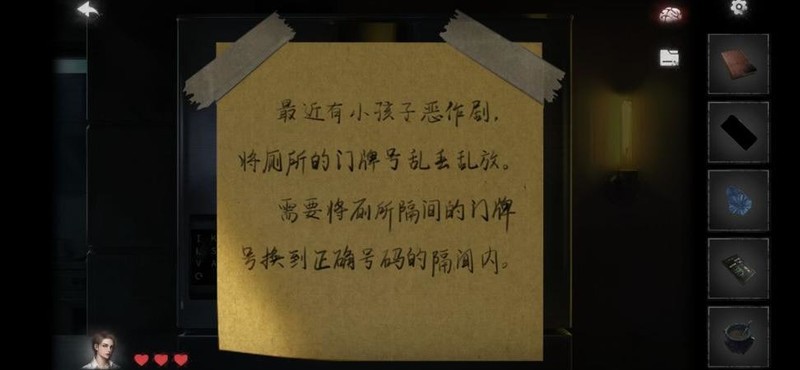 进入厕所,依照线索3调整颜色板顺序,获取第二块木板(图示非正确答案)。