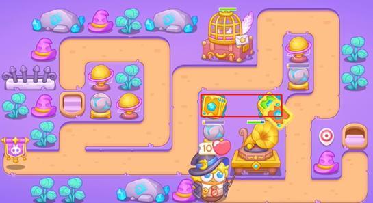 清理留声机后放置卡牌攻击冰晶,当兔子出现时用上方炮塔进行攻击。