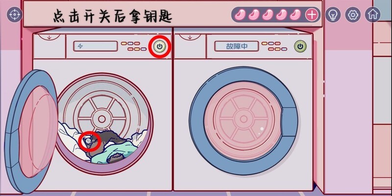 点击和,再点击洗衣机,把脏衣服放进洗衣机内,洗衣液倒入洗衣槽,放下熨板并放上熨斗。