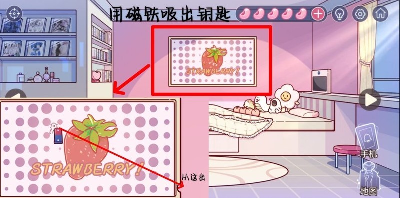 点击挂画,用磁铁吸住钥匙,拖至下方缺口取出。