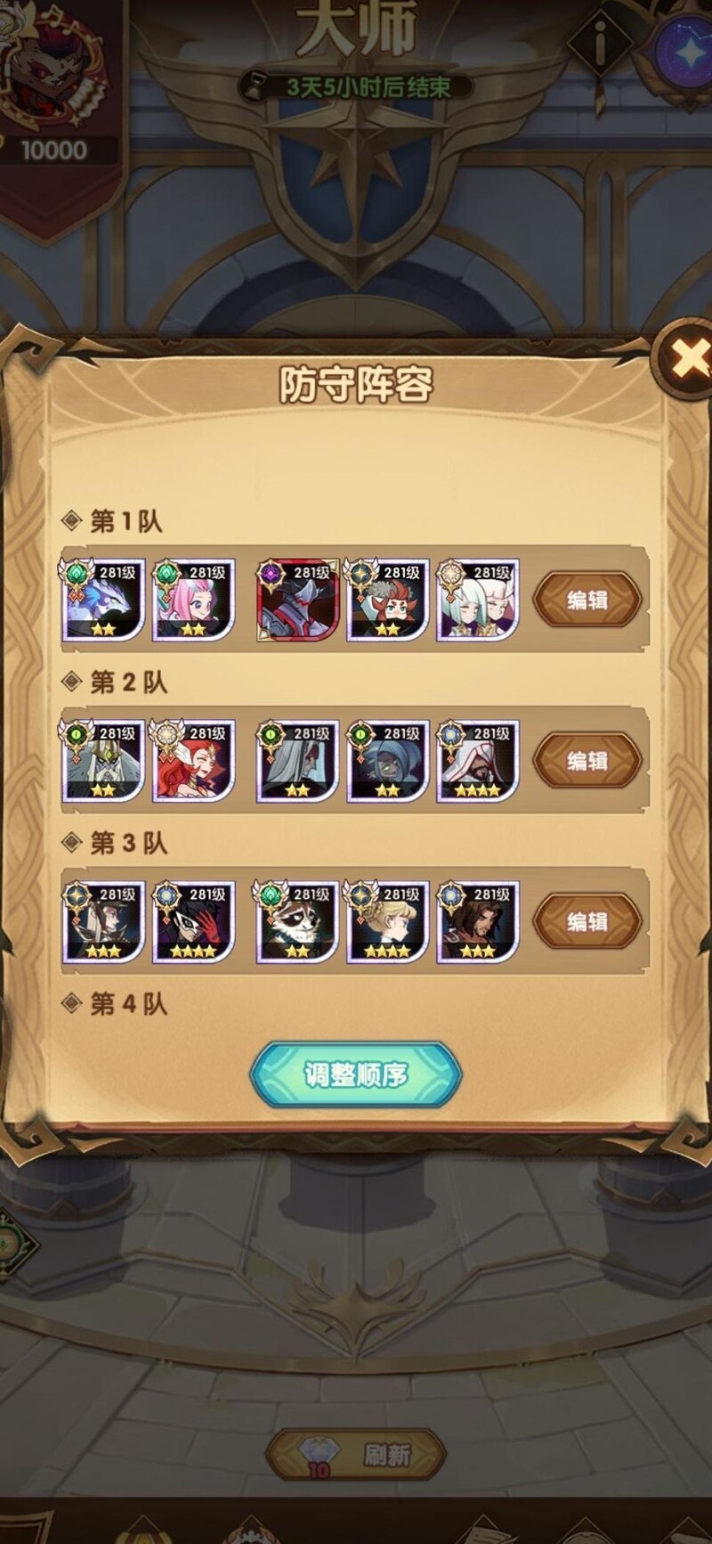 防守与进攻阵容保持一致。第一队使用蜥蜴神魔搭配骨轮,主要针对没有九红或练度较低的冬侯亡灵队伍,效果显著。第二队以骨轮为核心,几乎能应对所有绿箭体系阵容,骨轮向来克制绿罩弓骑组合,此次甚至多次成功抵御蜥蜴神魔的强攻,表现超出预期。第三队为游侠速杀阵容,对蜥蜴能量队极为克制,实战中屡建奇功;需注意浣熊与恐魔应分站对角,利用浣熊的免疫控制特性规避恐魔技能干扰,该阵容也可用于挑战后排三人配置的亡灵队伍,但主要目标仍是压制蜥蜴能量体系。第四队为虚空阵容,其强度和机制圈内熟知,无需多言。第五队采用绿沙狼组合,专克弓骑以及练度不足的冬侯亡灵队。冲击大师段位过程虽有波折,9900分屡次失守,但最终依靠游侠速杀队制造对手翻车机会,成功登顶大师,整个过程更像是一场耐心与策略的赛马比拼。