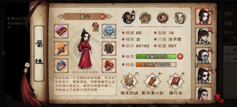 角色出生后可自由选择初始武器,此选择对后续拜师及功法学习无影响,前期基础功法消耗阅历较少。建议尽快推进主线,尽早前往各大门派拜师学艺。可选门派包括:太乙山太乙(主修剑法、拳法)、明月峰泠月(主修剑法、拳法)、嵩山少林寺(主修棍法、拳法)、落霞镇天刀门(主修刀法)、鄯善苍狼门(主修枪法)。其中少林、泠月、天刀因副本通关效率较高而广受欢迎,网络上也有诸多关于门派最优选择的攻略可供参考。个人偏好泠月,一旦选定便未更换(虽初始多赠10万阅历,但后期出师难度较大)。建议在确定长期发展的门派与核心功法体系后,再根据自身流派需求规划随从配置,进而决定培养或获取哪些随从角色,以实现战力与养成路线的最优搭配。
