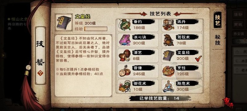 优先将炼丹、音律、烹饪升至150级以上,按重要性排序。每日完成40次钓鱼任务,其余技能可随意学习(特殊门派除外,如太乙修道法、少林练佛法)。尽早获取文皇经与胎息术,并重点提升雁行功和水上漂至九层。