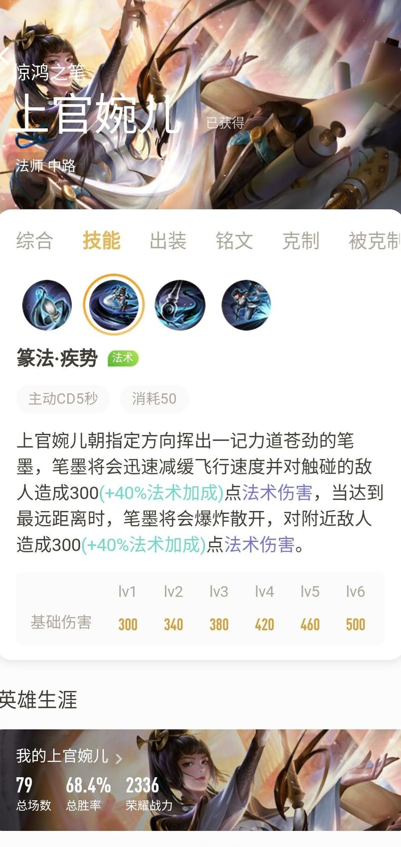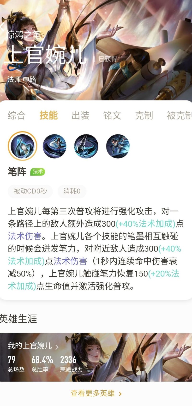 释放大招后可刷新冲刺效果,输出时应结合笔阵的范围伤害与强化普攻,以提升整体伤害。上官婉儿一套完整连招配合被动,伤害轻松破千。