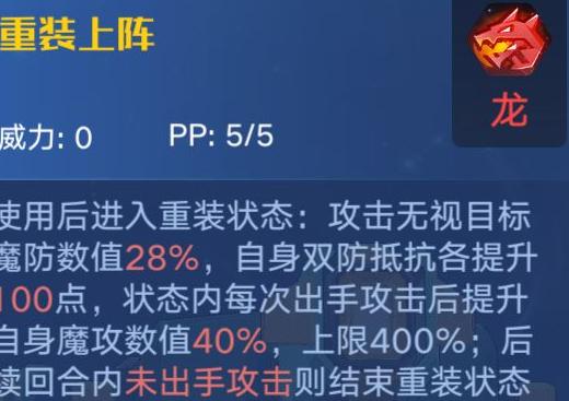 开启二技能后进入重装状态,可无视目标28%的魔防,自身双抗提高100点。每次攻击可提升40%魔法攻击力,最多叠加至400%。若施放技能后未进行攻击,则状态立即解除,例如被冰冻等无法出手的情况,技能效果将直接消失。