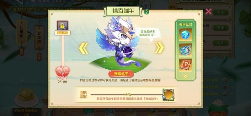 赠送粽子时,将三种粽子依次送给三位亚比:红枣粽给天天,豆沙粽给银河,鲜肉粽给共工。注意点击箭头切换目标,按顺序分配即可完成。