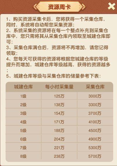 资源周卡:建造采集仓库后,系统每小时自动补充资源至仓库,每日采集量随仓库等级提升而增加。