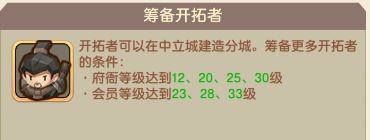 开拓者负责建造分城,可派往无叛军或未占领的中立城。提升府衙等级和会员等级可增加开拓者数量,助力更快拓展领地范围。