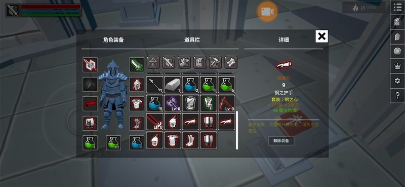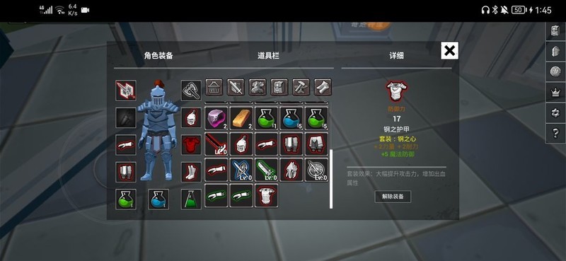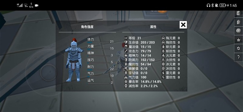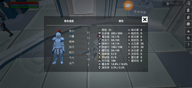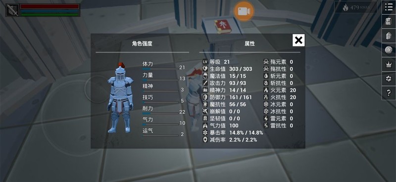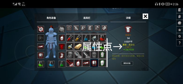 获得炎骑套装后又加了几点属性,技能方面出了一个防御大幅提升,还有一个被动是体力大幅增加。这两个被动在游戏前期效果非常明显,让14级的骑士坦度几乎翻倍,战斗力显著增强。