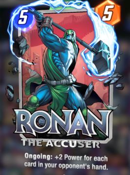 在漫威终极逆转中,罗南是一张5费5战力的卡牌,其效果为持续:对手每有一张手牌,便获得+2战力。