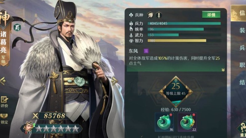 诸葛亮技能兼具谋略伤害、提升己方士气和削弱敌方士气,攻防兼备,是一位综合能力极强的武将。