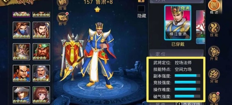 通过官方武将介绍中的能力属性面板,可以直观了解武将的综合实力。鲁肃之所以经久不衰,源于其全面而出色的性能表现。无论副本挑战、竞技对抗还是破气能力,均达到顶尖水准,足以与年度武将正面抗衡。其综合属性评分仅次于三位主公级武将,兼具副本输出与PVP控制的双重优势。凭借极强的破气与破招双破能力,鲁肃在各类副本中如鱼得水,面对高难度内容亦能从容应对。攻守兼备、控场能力出众,真正实现全场掌控。尤其在当前主流的秘境副本中,他凭借先天优势和全能定位,不仅能强势破除护盾,更以主宰级输出稳居核心地位,尽显王者风范。