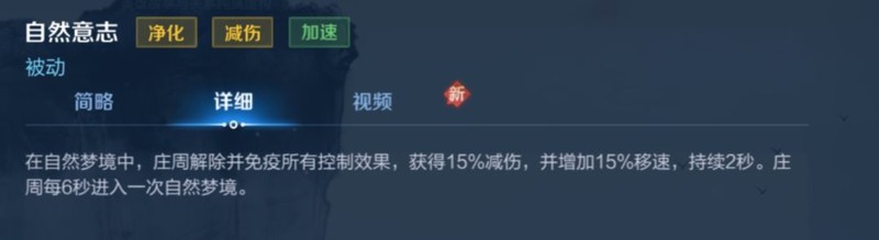 每6秒自动进入持续2秒的自然梦境,梦中移速提升15%,并免疫控制效果,同时获得15%减伤。