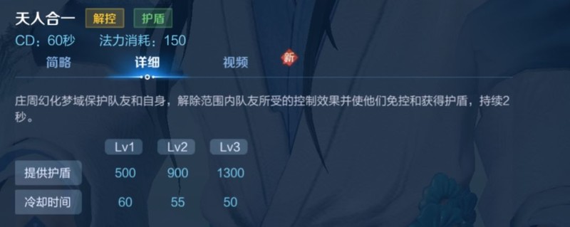 技能描述中提到庄周进入自然梦境,其实暗示了1技能可以主动触发被动效果,也就是免控+加速+免伤的强大能力,每次持续2秒。