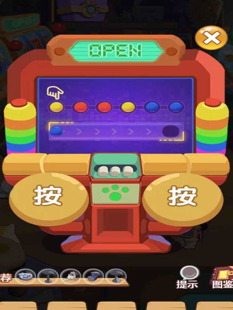点击中央游戏机开始游戏,输入密码猫头鹰、熊猫、大象、鸟,其英文首字母组合为O.P.E.N,对应数字顺序3412。解锁后根据屏幕上三角形提示,观察上方彩灯颜色,再返回游戏机将彩灯调整为指定颜色组合,满足条件后即可获得道具。整个过程需按提示逐步操作,注意颜色与顺序的匹配。
