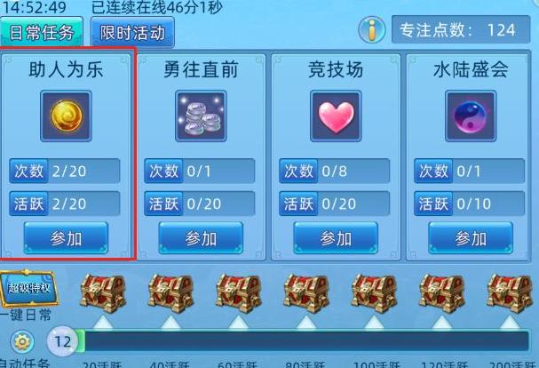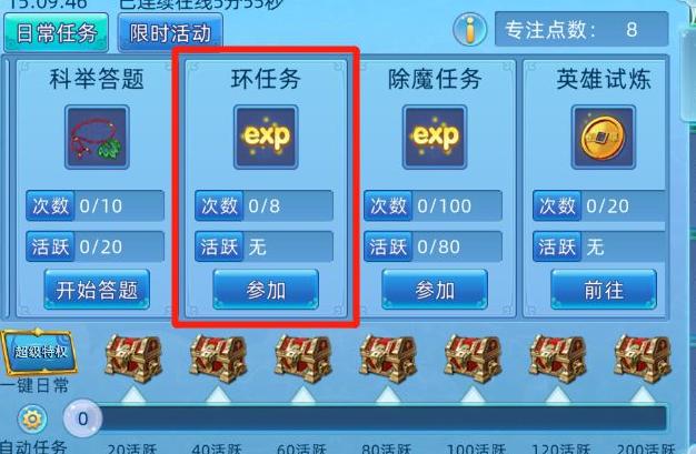 小技巧:完成除魔任务可消耗专注点,获取五倍经验奖励。每次任务均有专注点加成,大幅提升升级效率。参与方式:进入→→,点击即可参加。
