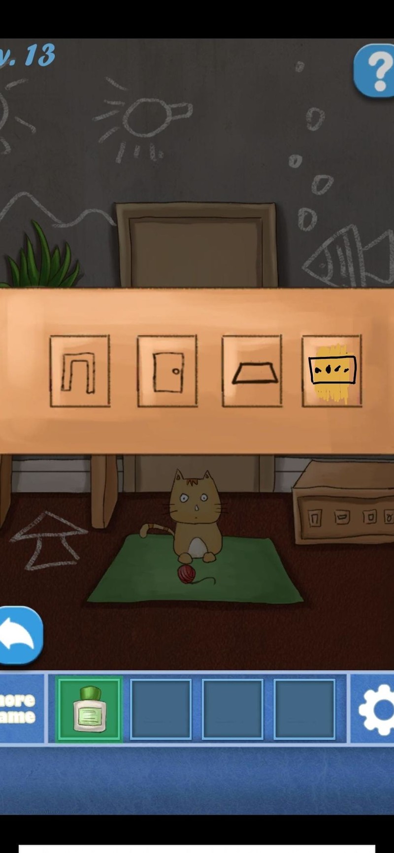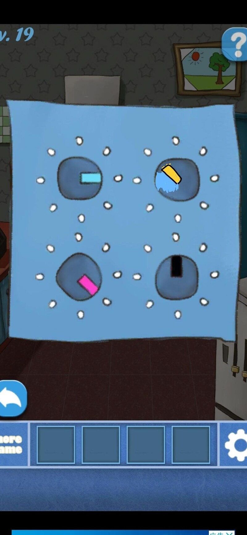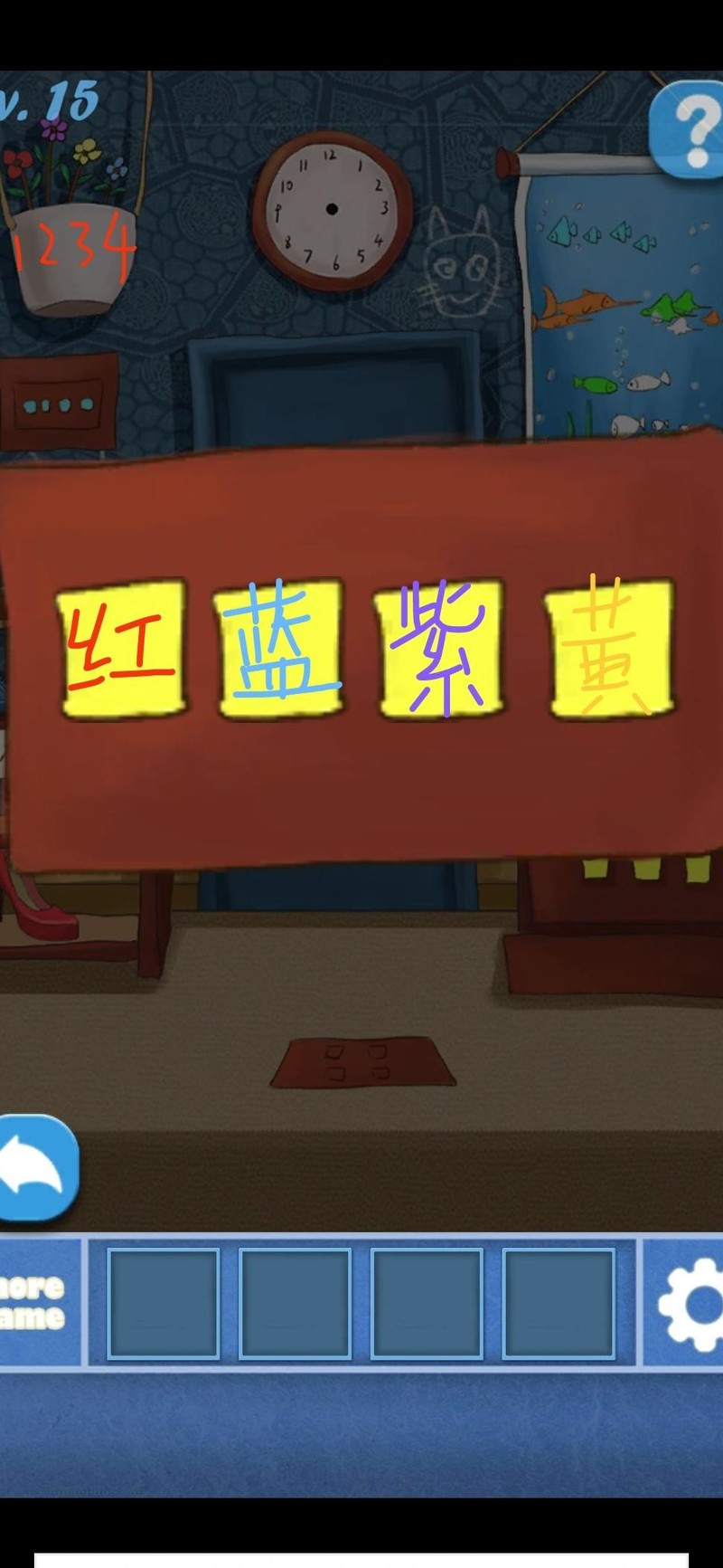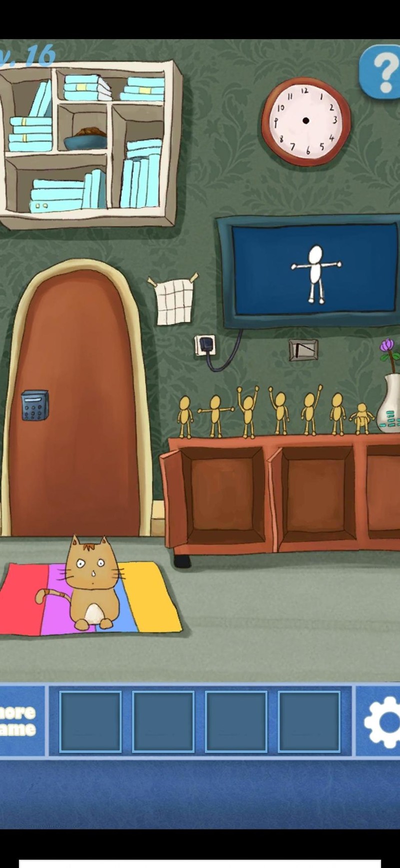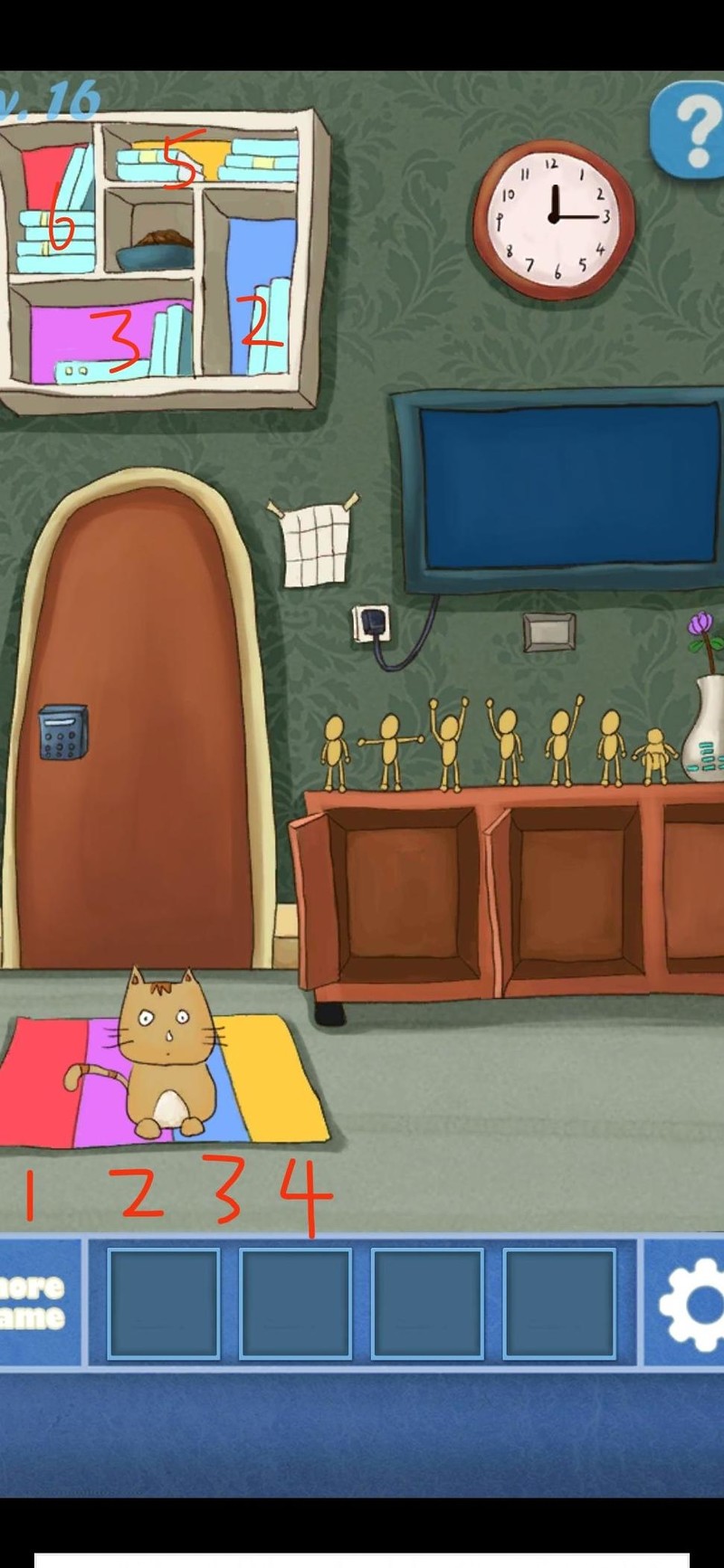 观察右侧花瓶上的数字,可得提示1423。点击画面中标记出的位置,依照该顺序操作拨动装置:第一列无需操作,第二列点击三次,第三列点击一次,第四列点击两次,完成后获得一根逗猫棒。使用逗猫棒点击小猫,引出并取得一把钥匙。用钥匙打开右下角的锁,同时开启左侧柜子,从中取出一支笔。将笔用于墙上悬挂的纸张,显现出图形密码:圆形、加号、三角形、长方形。随后点击图形锁,依此顺序输入密码,解锁后获得铁铲。使用铁铲挖掘花瓶中的泥土,找到一个插头。将插头插入电视机旁的插座,电视随即播放一段动画。根据动画中人物出现的顺序,调整下方小人模型的排列位置,完成解谜。