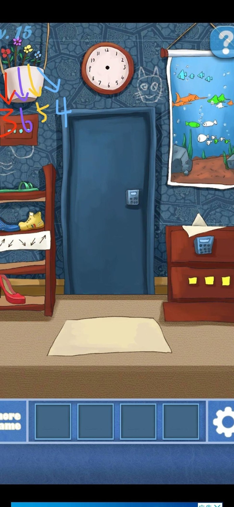 观察鞋柜共四层,自上而下为1至4层。根据时钟提示的颜色顺序红、蓝、绿、黄,可确定各色鞋子所在位置:绿色在第一层,黄色与蓝色在第二层,红色在第四层,第三层为空。由此得出对应关系:红为4,蓝为2,绿为1,黄为2,组合成密码4212。点击门边密码锁,输入4212即可成功通关。