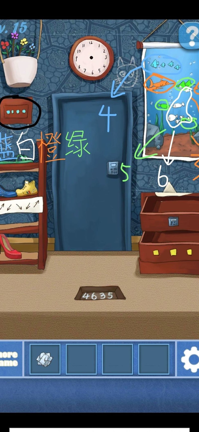 观察右侧挂画中的鱼,蓝色4条、白色6条、橙色3条、绿色5条。根据地上提示的数字4635,左侧颜色锁顺序为蓝、白、橙、绿。解锁后取得时针与分针,将其安装到时钟上即可。