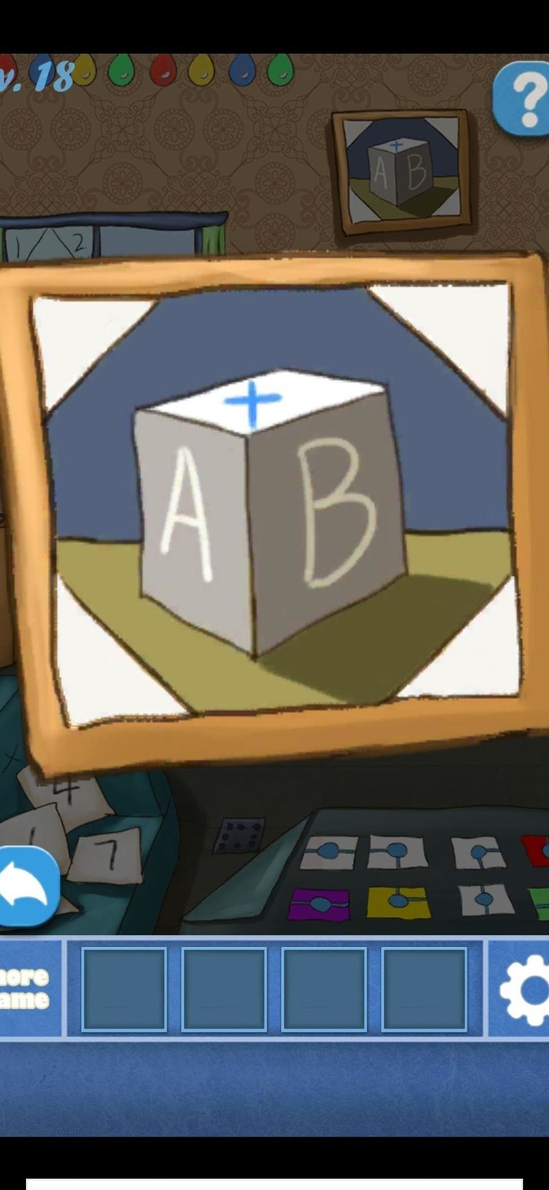 点击上方的长方体,多次点击后会出现所示图案,实际判断依据是长方体下方的桌子,但只需随意点击即可。此处设计可能是为了提示查看地毯下密码的方法。随后掀开地毯,点击左下角的凳子,便可进入下一画面。