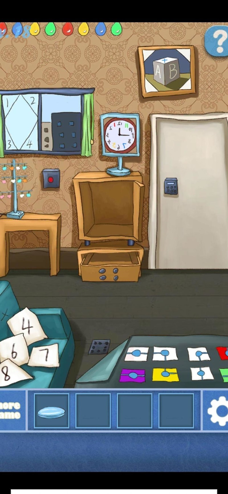 依据沙发上的数字卡片提示,4678对应蓝白蓝橙,点击时钟下方的颜色锁,按此顺序操作即可。