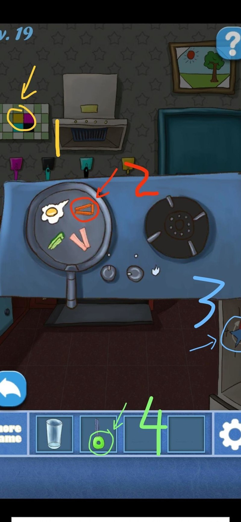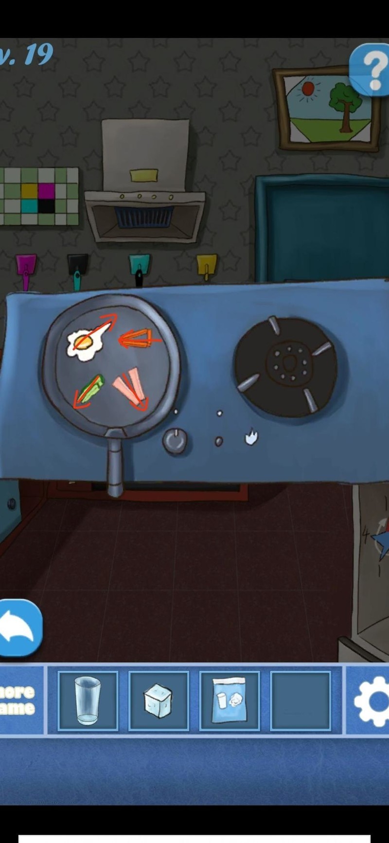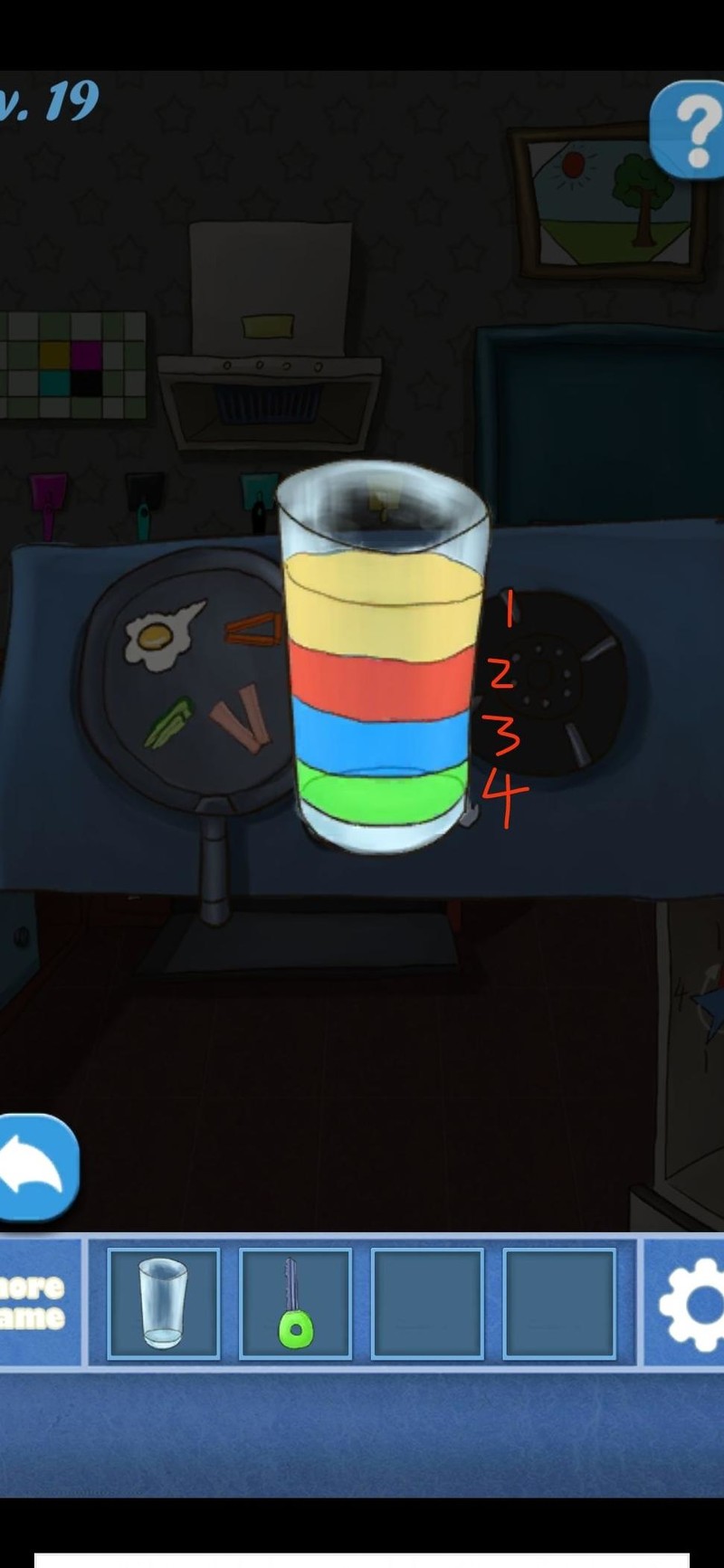 点击黄色吸盘处的抹布,擦拭脏污的画作,获取提示:黄为1、粉为2、蓝为3、黑为4。查看灶台下方箭头,自上而下顺序同样为1234,将颜色与箭头方向对应,得出解法图示,取得空水杯。接着观察吸盘上悬挂的厨具,对照右下角密码锁,第一列点击两次,第二列一次,第三列不点,第四列三次,成功开启后获得冰块。