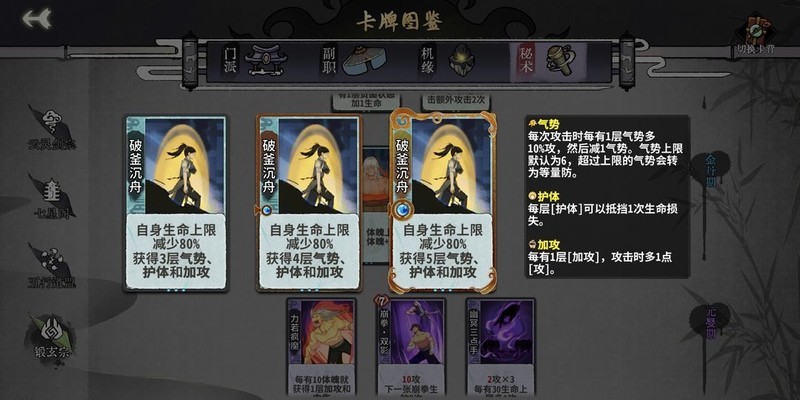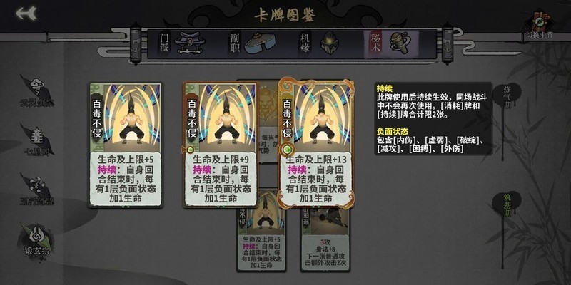 在副职选择上,气崩和锻体大成的卡组不占优势,丹修则较为常见。符咒和阵法类的消耗牌能较好地控制每回合的锻体数量,但后期能力较弱。琴艺和绘画则偏向用毒路线,而种草流则专注养生回血(天赋选择根基,手牌储备加血草药,伺机而动)。