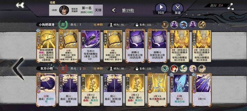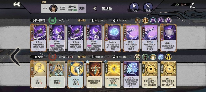 有两种开局策略:前期通过卡组循环在二三轮结束时拥有40生命,优先提升体魄至3~6次。在第二轮回体魄达到9后升级本源。此时对局通常一轮半便可决出胜负,因此卡组中需包含一张锻2前置和一张锻1后置,在关键回合能刚好锻出5次,直接压死对手。随后卖掉手中牌换取修为,以确保先手优势。整个过程中保持稳定的5体魄增长,通常能比对手快一回合完成55锻并化神,从而稳定获取优势。
