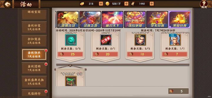 金秋快乐活动开启,玩家可通过字卡兑换所需资源。新区玩家可兑换陨铁,老区玩家则兑换战魂经验。推荐兑换顺序为:武将令优先,其次是诸葛瑾升星卡、战魂精华、普天同庆宝箱,最后为诸葛瑾时装体验卡。