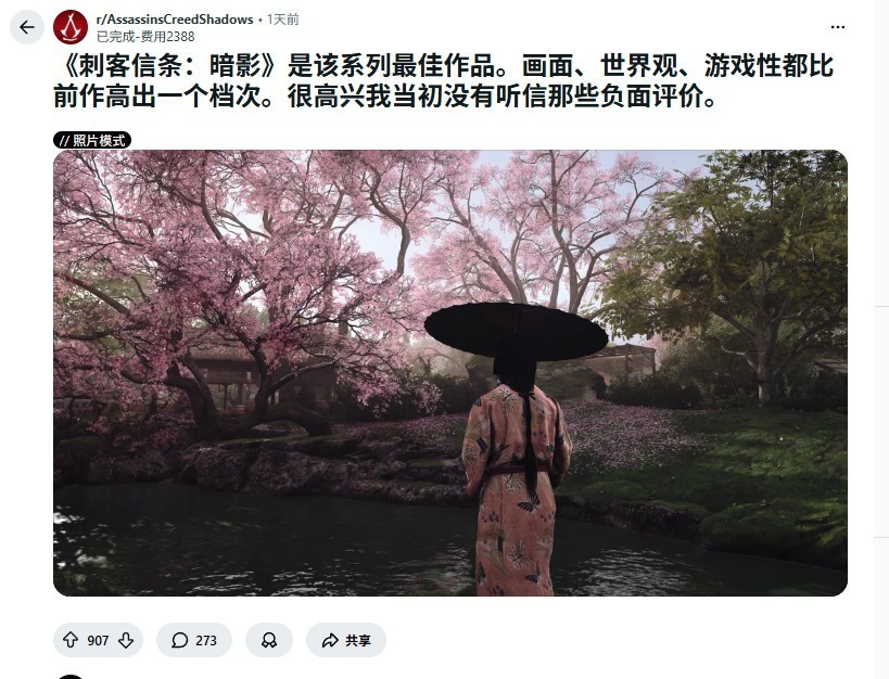 帖中附有一张游戏内照片模式截取的画面,构图精妙、光影细腻,被众多评论者称为“画面封神”。