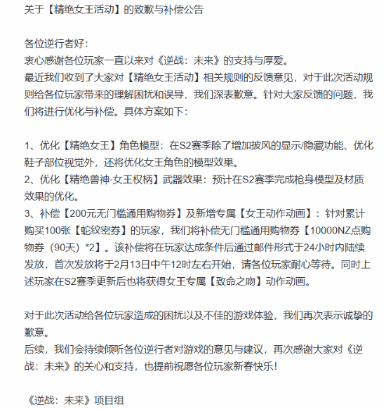 逆战:未来近期上线的至臻角色“精绝女王”引发玩家广泛关注,部分玩家指出活动规则存在理解偏差,影响了付费体验。运营团队对此高度重视,就活动中出现的问题向全体玩家致以诚挚歉意,并同步公布优化与补偿方案。