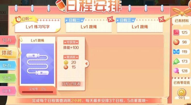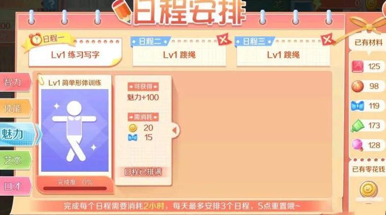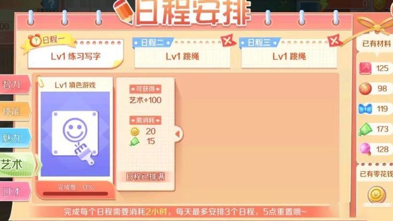 每日5点刷新日程,每项活动耗时2小时,宝宝每天最多可安排3个行程,请合理规划时间。
