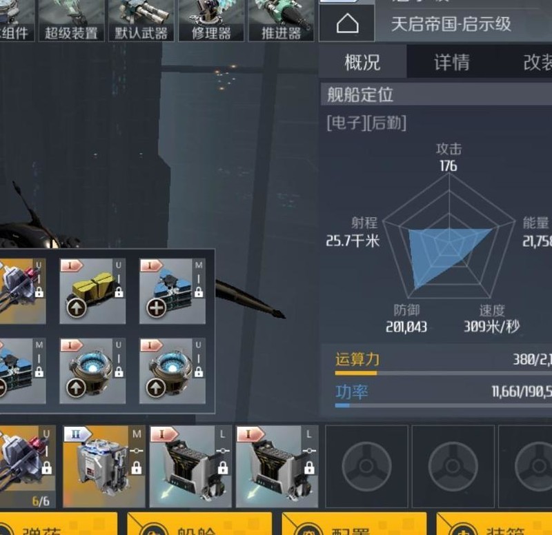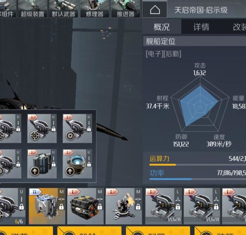 装备槽配置:中型离子推进器、护盾回充装置与应急能量注入模块。