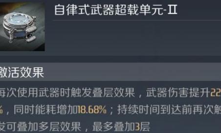 每次使用武器可触发增益效果,提升22.5%伤害并增加18.68%能耗,效果持续期间重复使用可叠加,最多叠加至三层,强化战斗输出能力。