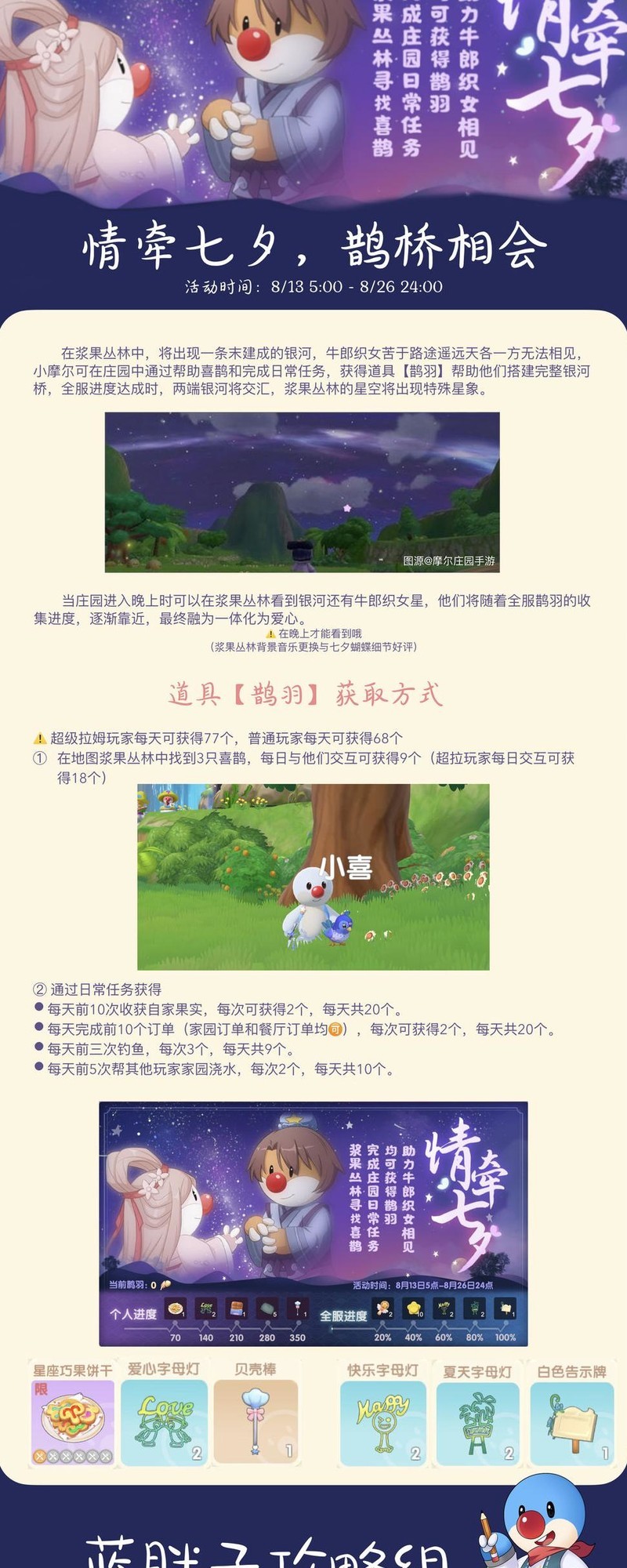 在浆果丛林地图中,将浮现一段未完成的银河,牛郎织女因天堑相隔难以相聚。小摩尔可通过在庄园协助喜鹊,收集道具,助力搭建完整的银河之桥。当全服玩家共同完成建设进度,银河两端将相连交汇,浆果丛林夜空将显现独特星象奇景。参与者可根据个人贡献及整体进度领取贝壳许愿棒奖励,活动期间与超拉小摩尔互动获取鹊羽的效率将提升一倍。