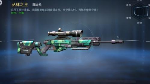丛林之王凭借迷彩外观与消音系统,隐蔽性极强,威力惊人,搭配中毒效果,兼具爆发伤害与持续掉血特性,是一款攻守兼备、性能卓越的强力武器。