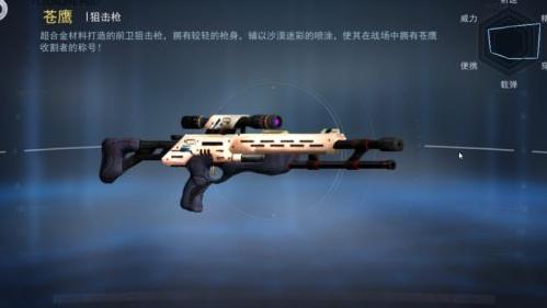 苍鹰采用合金枪身,搭配沙漠迷彩涂装,设计前卫,威力强劲,在狙击枪中具备出色的便携性,射击性能优异,尤其适合擅长灵活走位的高水平玩家使用。