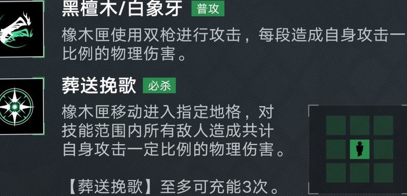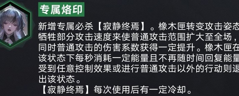 不得不重点提及的是橡木匣所拥有的专属烙印效果。此次新增的专属必杀技机制,类似于卓娅的大招设计,通过降低攻击速度来换取更高的伤害输出,同时其普通攻击范围扩展至整个战场——全场打击!这种覆盖全图的攻击模式堪称其核心亮点,也是橡木匣最具辨识度的能力所在。在部分副本环境中,这一特性将极大提升战术灵活性,带来类似使用哈梅尔时那种无需频繁调整站位的畅快体验。释放专属必杀期间,角色会持续消耗能量且能量不再自动回复,这在一定程度上限制了她的持续作战能力,但该技能支持手动中断,并可在冷却结束后再次释放,赋予玩家更强的操作掌控感与策略选择空间。综合来看,这一系列机制使得橡木匣作为远程输出角色具备了极高的战略价值和战斗预期。只要技能数值设定合理,其实战强度值得期待。另外,也希望未来相关外观设计能够得以保留,不被调整。愿这份期待长存,继续前行!以上内容便是本次分享的全部信息,希望能为各位提供些许参考与帮助。若有更多疑问,欢迎通过指定渠道进一步交流。感谢一路以来的关注与支持!