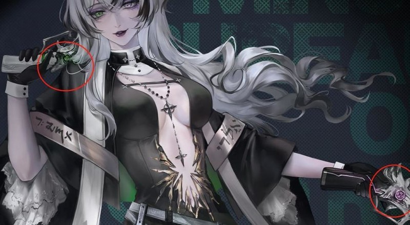 从图中可以看出,橡木匣双枪上分别镶嵌着绿色与淡紫色的圆球状物体,这与她双眼的特征高度相似。由此推测,她的武器与眼睛之间存在某种深层联系。结合PV中那句透过我的眼睛,你看见了什么,或许暗示着视觉与力量的关联。而她所进行的仪式,很可能正是通过这双特殊的眼睛与双枪共同完成,耐人寻味。