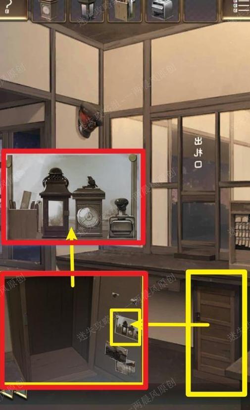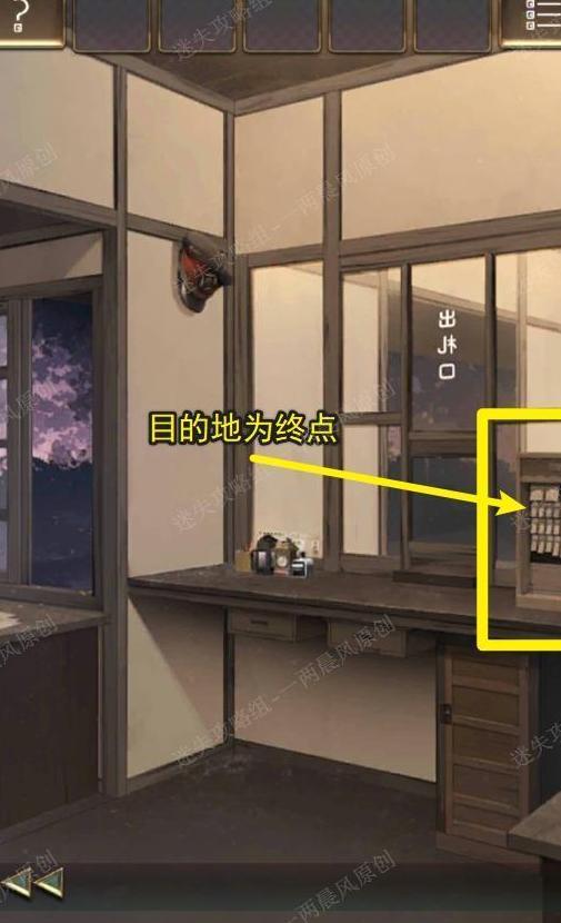 进入房间右下方已开启的柜子,点击柜门上的照片,根据照片中的提示,将、、、按图示顺序摆放在桌面上,完成摆放后出现文字线索:目的地为终点。