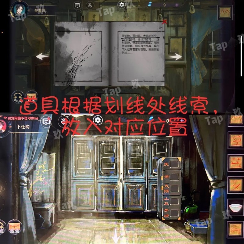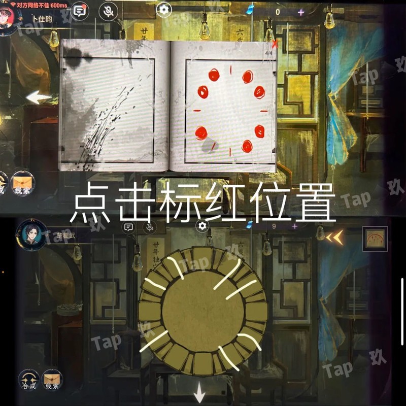 点击拾取桌上的书,发现红色线条线索,立即告知对方。