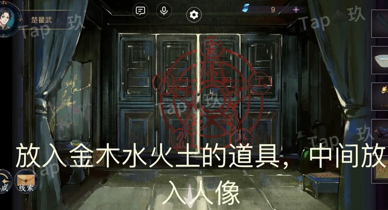 点击大门右下角的机关解谜,获取元素。