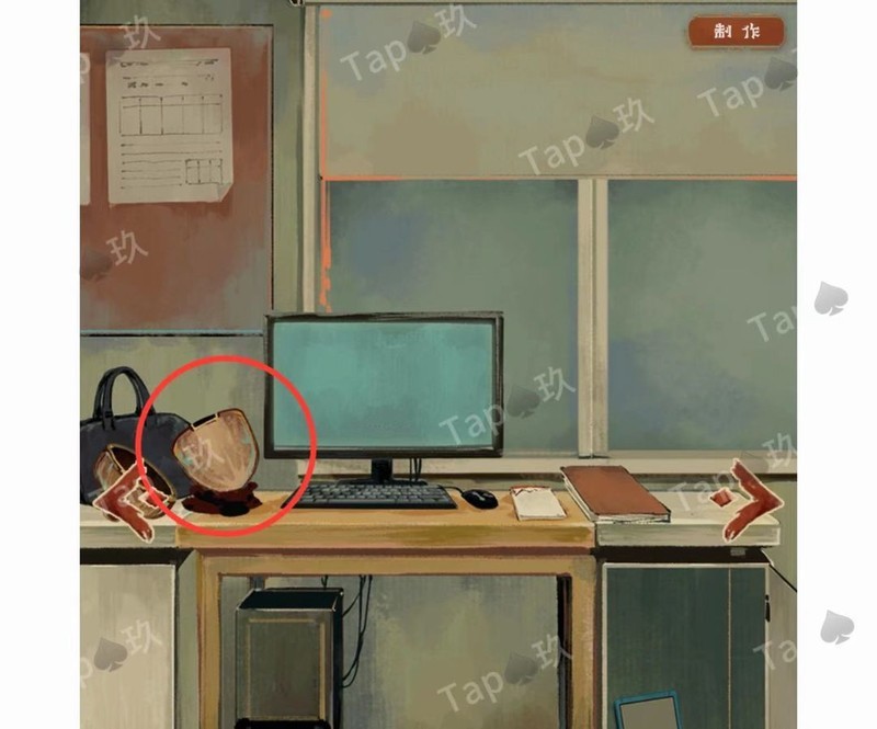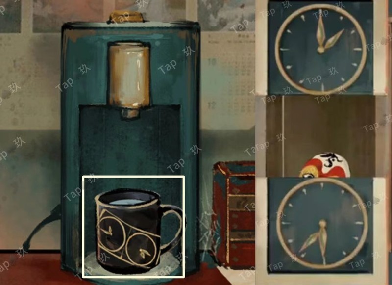 在桌子上的饮水机处,放上马克杯并打开开关,获取钟表图案线索。