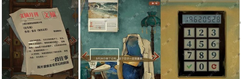 点击密码箱,结合日历和报纸线索开启箱子(19620528),获取面具顺序提示。