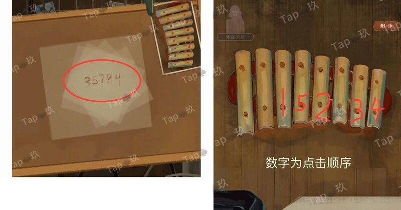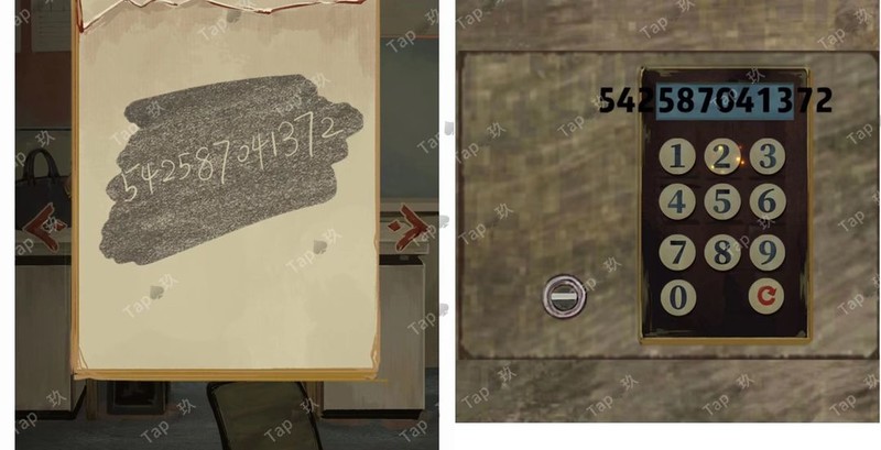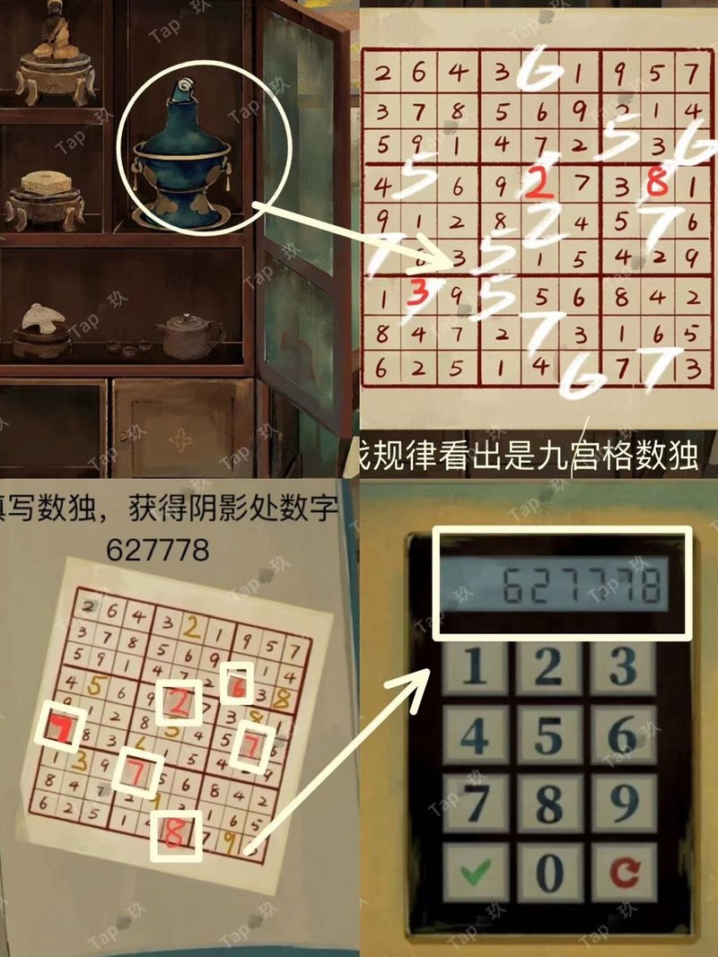 点击密码锁,按照九宫格提示输入(627778)开启密室。