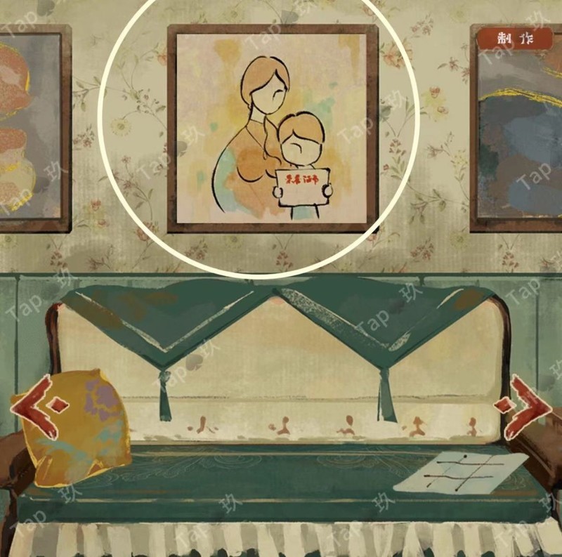 点击沙发旁九宫格,按图调整,获取,再点中间挂画放入。